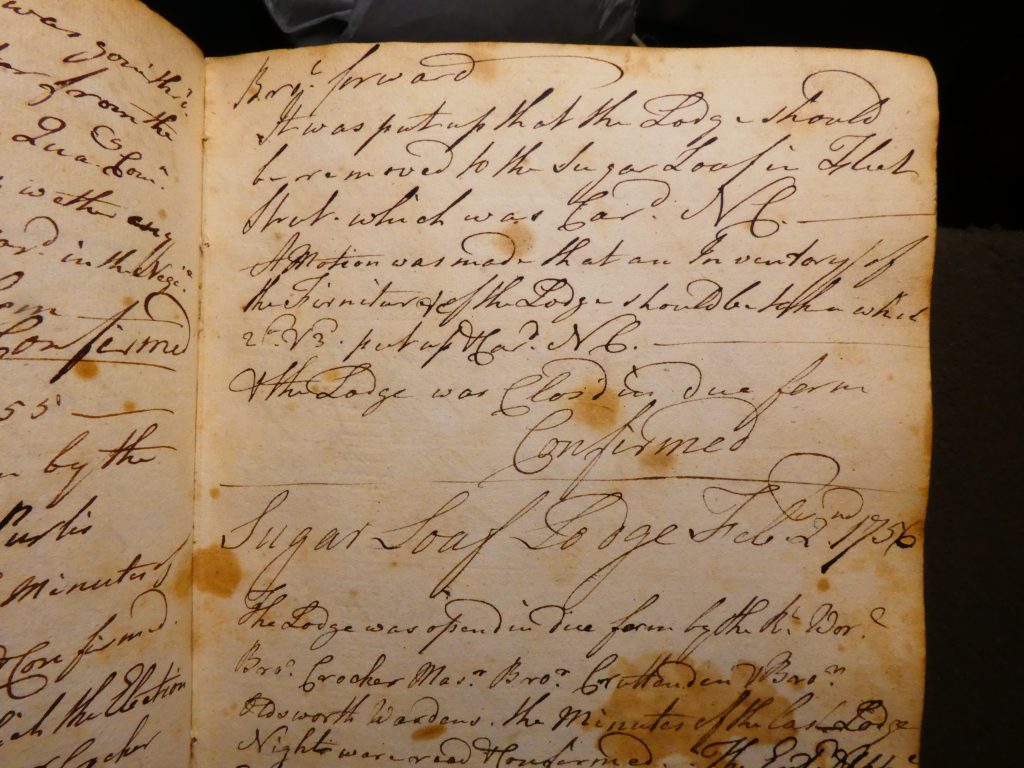 An excerpt from the Lodge Minute book dated 18th November 1751 which refers to “the previous Lodge Night”. This includes the proposition that a Master’s Lodge be held every Sunday night. A ‘late’ Minute book entry as Rummer Lodge dated 19th Jan 1756, before relocating to the ‘Sugar Loaf’.